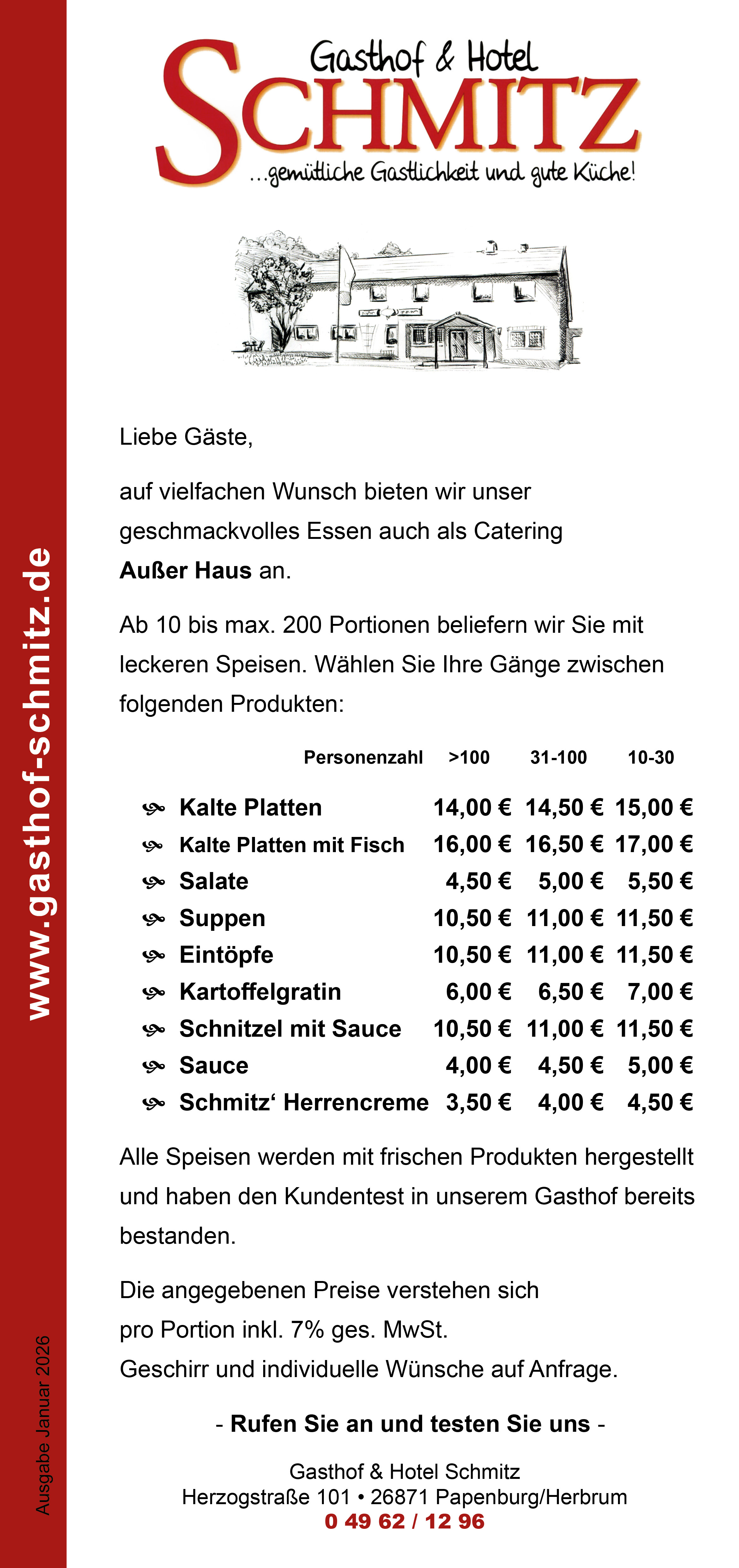 Auf vielfachen Wunsch bieten wir unser geschmackvolles Essen ab sofort auch als Catering Außer Haus an.